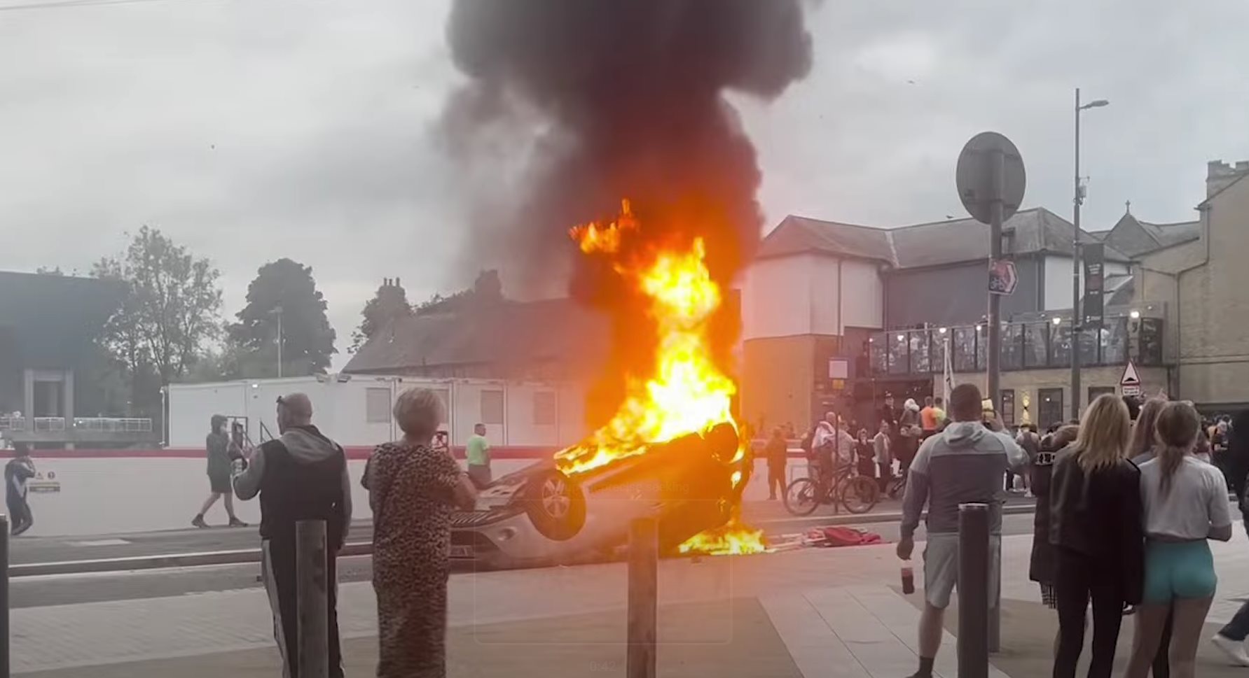 Anti-imigrantski prosvjednici bacali su kamenje na policiju u blizini džamije u gradu prije nego što su prevrnuli vozila, zapalili automobil te požar pokraj policijskog ureda, javlja BBC.
