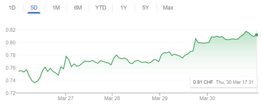 Vratimo se na banke, to je glavna tema danas. Valjalo bi odgonetnuti što se točno dogodilo i hoće li se u većem ili manjem obujmu ponoviti. Za početak, kako to da je tako naglo došlo do stabilizacije? Jer ako gledamo stanje u zadnjih nekoliko dana, nije loše - evo aktualne vrijednosti dionica posrnule Credit Suisse: