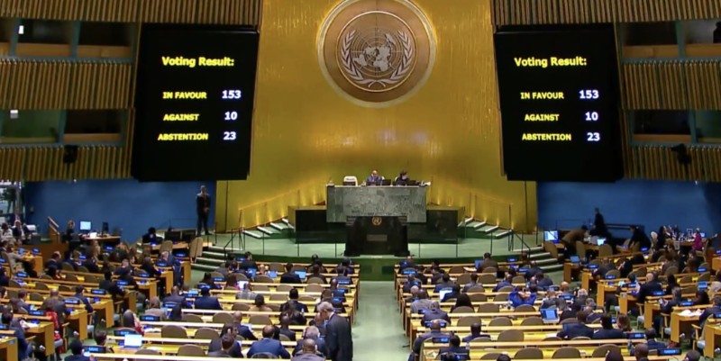 Rezolucija je usvojena sa 153 zemlje koje su glasale "za", 23 su bile suzdržane, a njih 10 je glasalo "protiv". Iako rezolucija nije obvezujuća, ona služi kao pokazatelj globalnog mišljenja.