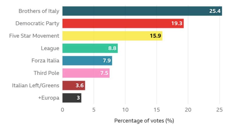 Giorgia Meloni, liderica talijanske desničarske stranke Braća Italije je na putu da postane prva premijerka Italije. Nakon jučerašnjih izbora njezina stranka postala je vodeća u Italiji dobivši 26% glasova. Konačni rezultati još nisu objavljeni, no očekuje se da će stranke njenih saveznika - Sjeverna Liga Mattea Salvinija i Forza Italija bivšeg premijera Silvija Berlusconija osvojiti 8.7%, odnosno 8.2%, a to sve zajedno biti će dovoljno za parlamentarnu većinu.