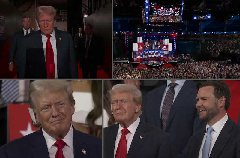 Trump je ušao u Fiserv Forum u centru Milwaukeeja s povezom preko uha dok je gomila skandirala "Borba! Borba! Borba!" dižući šake u zrak, što je bila referenca na njegovu reakciju u trenucima nakon što je ranjen.