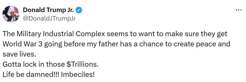 Riječ je o potezu koji bi mogao dovesti do znatne eskalacije. Donald Trump Jr. nije skrivao frustraciju te je na svom X profilu objavio kratku poruku u kojoj stoji: "Vojno-industrijski kompleks očito želi osigurati da započnu Treći svjetski rat prije nego što moj otac dobije priliku stvoriti mir i spasiti živote. Moraju osigurati te bilijune dolara. Životi su im nebitni!!! Imbecili!".