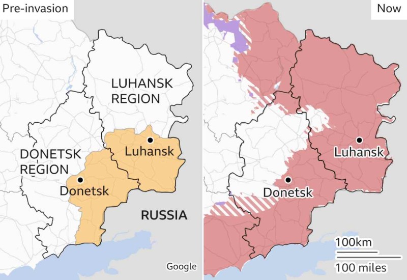 Na gornjoj slici označeno je stanje u regijama Donjeck i Lugansk prije početka invazije te (na desnoj strani) aktualno stanje ovog tjedna.