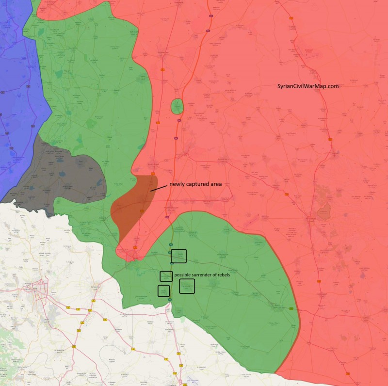 Sirijska vojska pokrenula je napade i u samom gradu Daraa te zauzela brdo Tal Zumaytiyah pa sada drži pod vatrenom kontrolom uzak pojas uz granicu s Jordanom koji spaja istočni i zapadni krak teritorija pod militantima. Prema nekim neslužbenim informacijama, 4. Divizija Sirijske vojske je okružila militantne u južnom dijelu grada Daraa, no to se čini pretjerano.