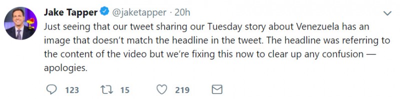 Tapper se kasnije ipak ispričao te je objavio: "Upravo sam uočio kako je naša Twitter poruka vezana uz događanja u Venezueli u utorak imala sliku koja nije opisivala naslov. Naslov se odnosio na video zapis, to smo sada popravili kako bi se izbjegla konfuzija - isprike".