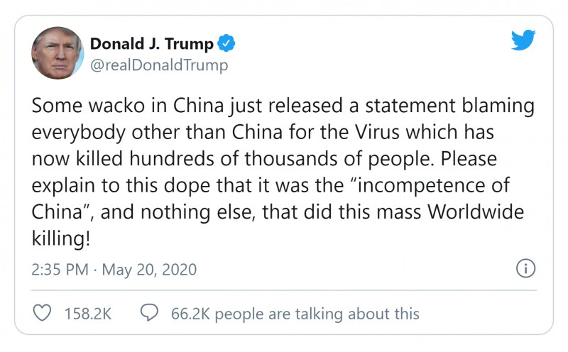 U svojem komentaru na Twitteru Trump je danas pak poručio: "Neki luđak u Kini upravo je objavio izjavu u kojoj krivi sve osim Kine za virus koji je do sada poubijao stotine tisuća ljudi. Molim vas, objasnite toj budali da je upravo 'nekompetentnost Kine', i ništa drugo, ta koja je uzrokovala masovno ubijanje ljudi diljem svijeta!"